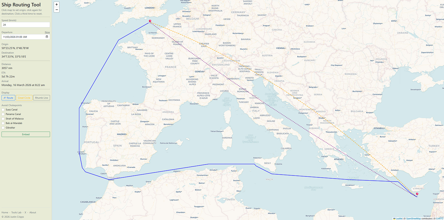 If you would like to experiment with the numbers yourself, you can try the Ship Routing Tool here and if you found this article or the tool useful, please consider subscribing.